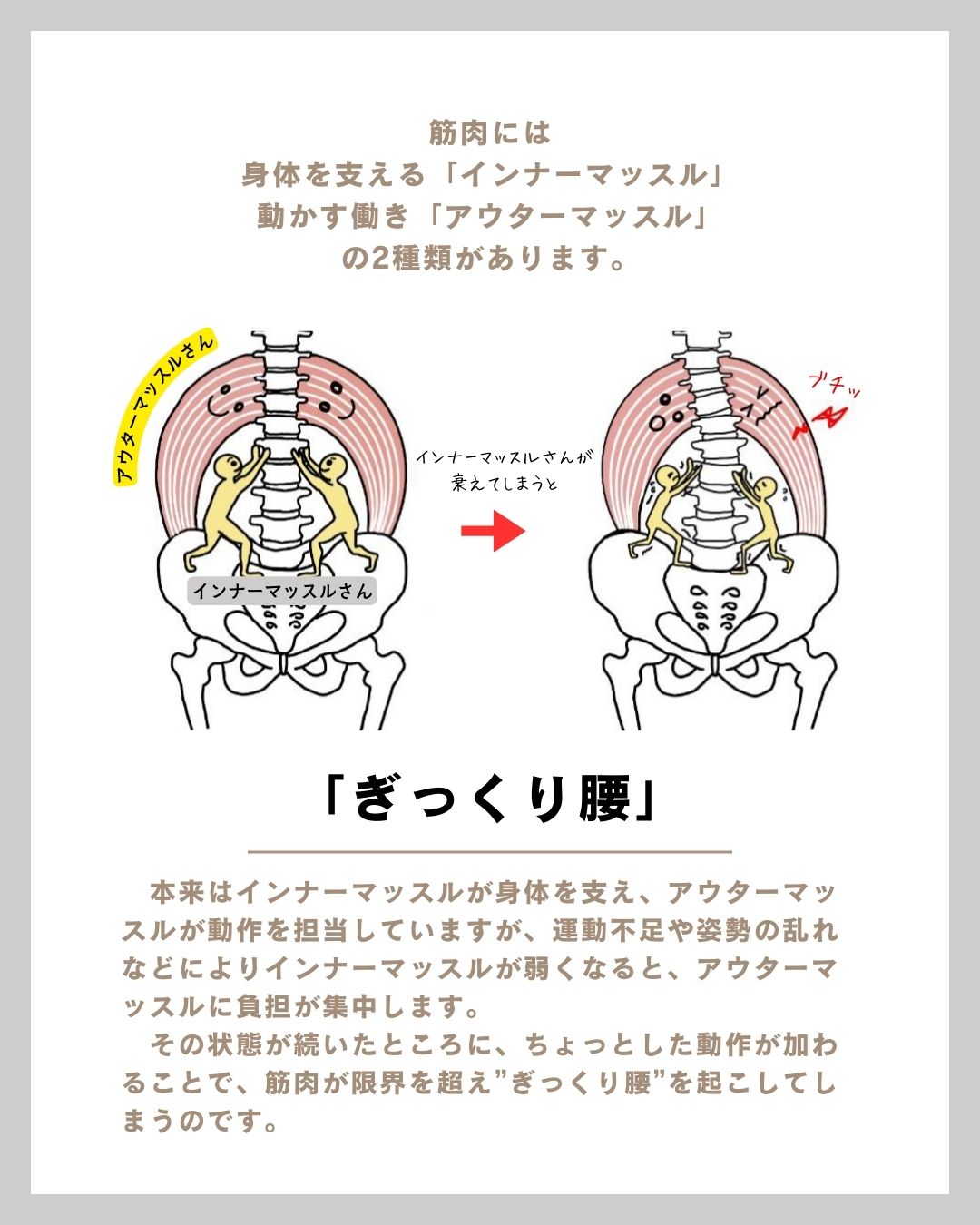 ぎっくり腰の多くは、間接ではなく筋肉のトラブルによって起こります。