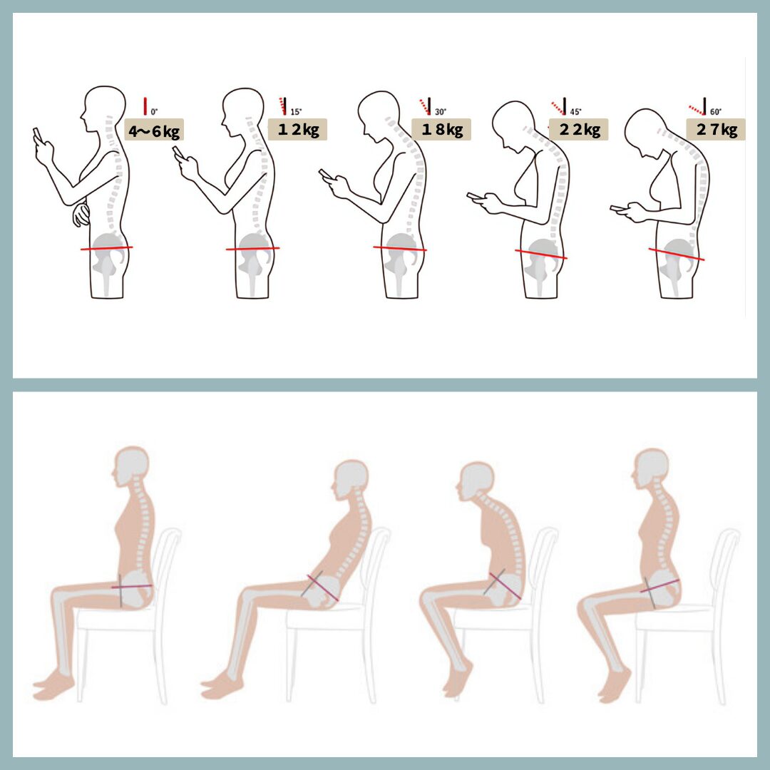 スマホを使うとき、多くの人は自然と頭を前に傾けて画面をのぞき込みます。この姿勢を長時間維持すると、首や肩に約4~27キログラムもの負担がかかり、背中が丸く、つまり猫背になる原因となります。