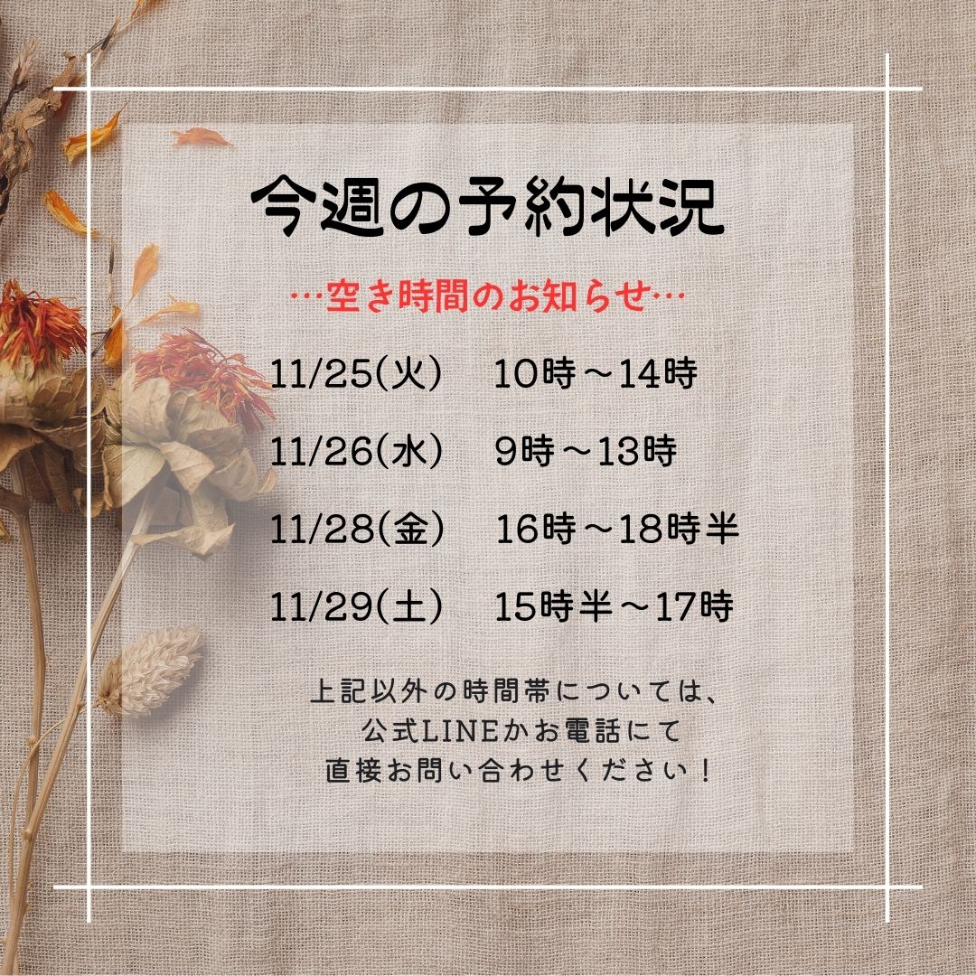※当日キャンセル等もありますので、下記日時以外にも空いている時間帯がございます。