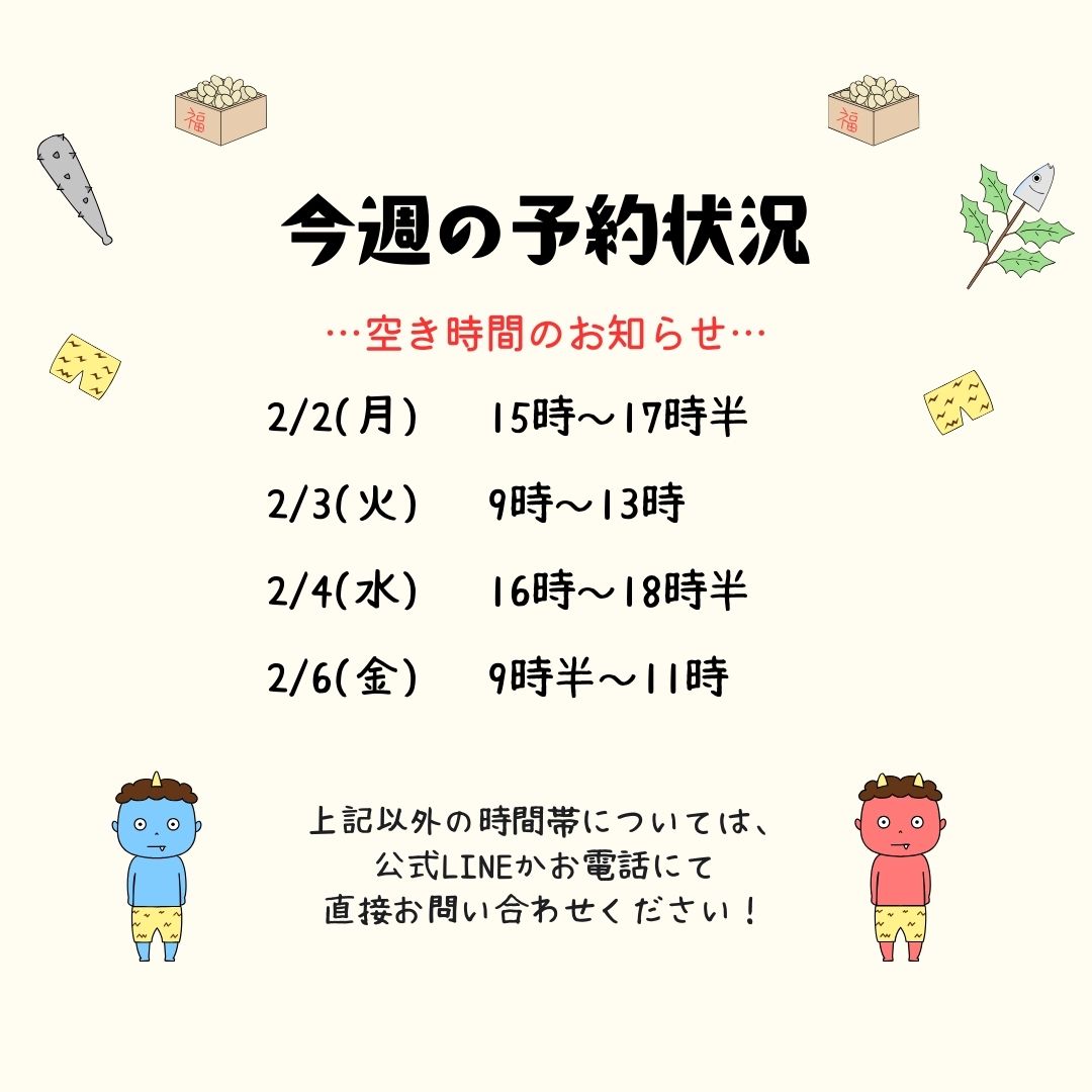 寒さが続くこの時期は、冷えや血流低下により、肩こり・首こり・腰痛・疲労感が出やすくなります。節分をきっかけに、身体の中の”疲れ鬼”も追い出して、スッキリとした状態で春を迎えたいですね(^^♪
