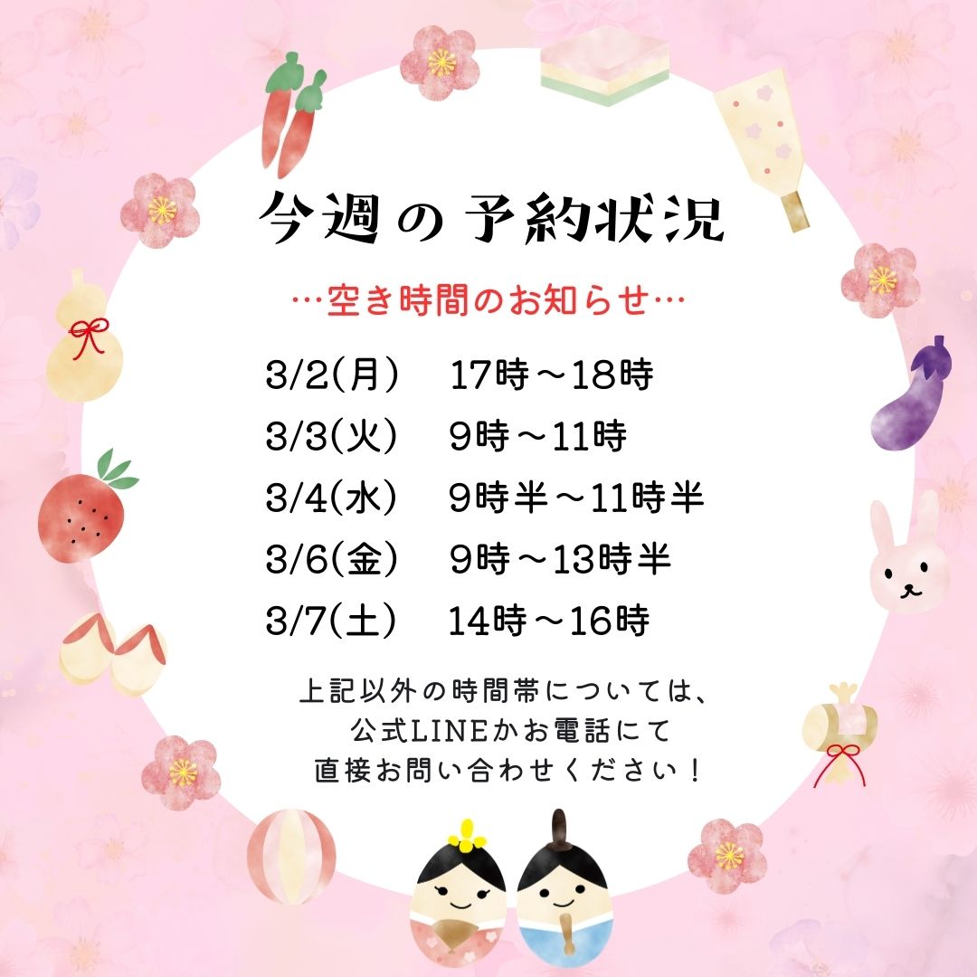 ※当日キャンセル等もありますので、下記日時以外にも空いている時間帯がございます。